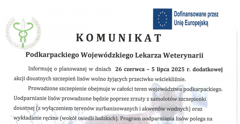 Działając na podstawie § 10 rozporządzenia Ministra Rolnictwa i Rozwoju Wsi z dnia 17 grudnia 2013 r. w sprawie przeprowadzania ochronnych szczepień lisów wolno żyjących przeciwko wściekliźnie (Dz. U. z 2013 r. poz. 1737), uprzejmie informuję o planowanej w terminie 26 czerwca – 5 lipca 2025 r. dodatkowej akcji szczepień lisów wolno żyjących przeciwko wściekliźnie. Uodparnianie lisów, podobnie jak w latach poprzednich, przebiegać będzie w formie samolotowych zrzutów szczepionki doustnej.