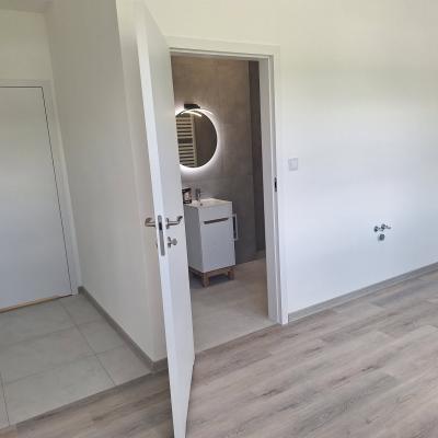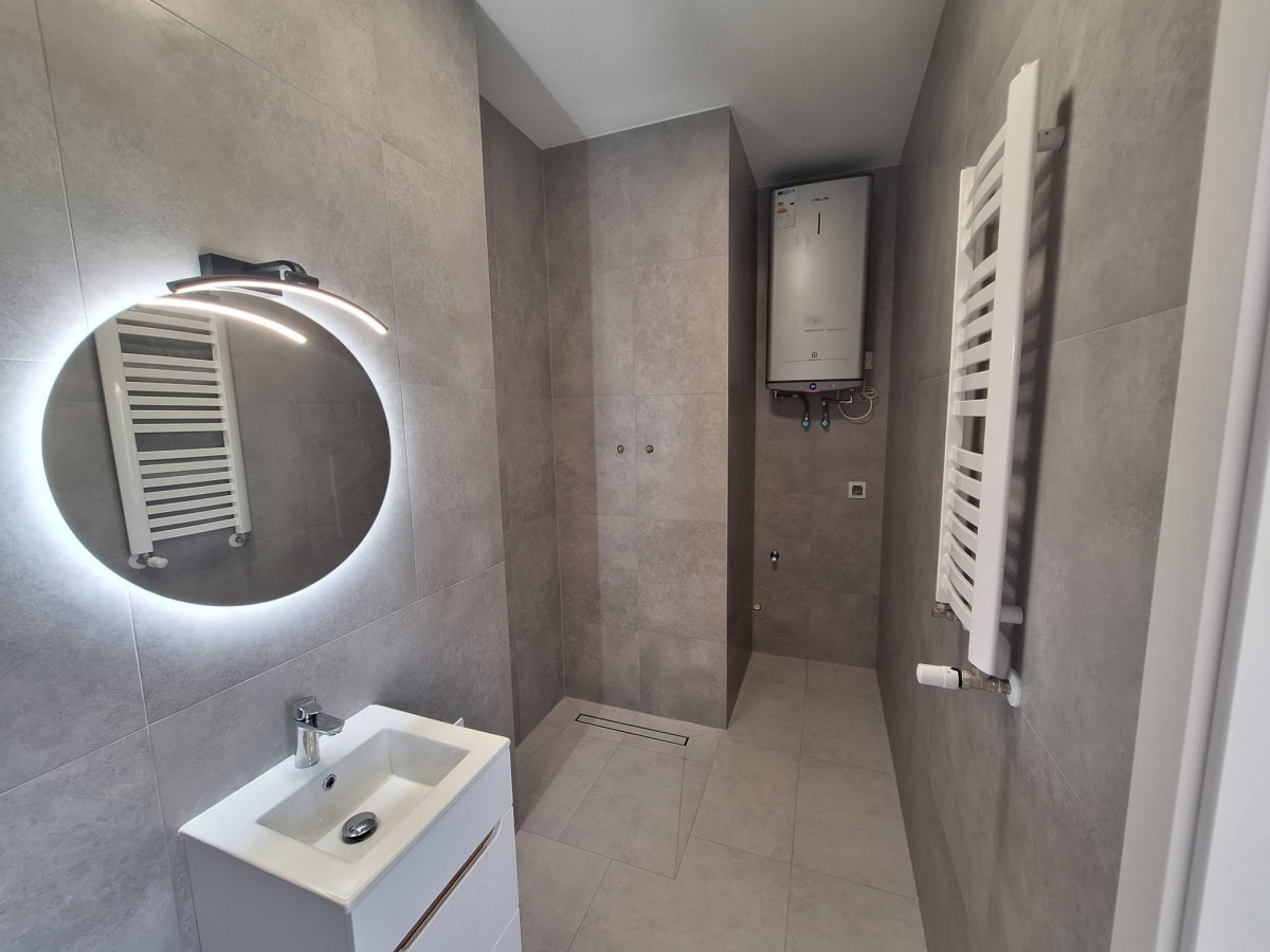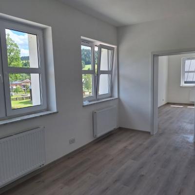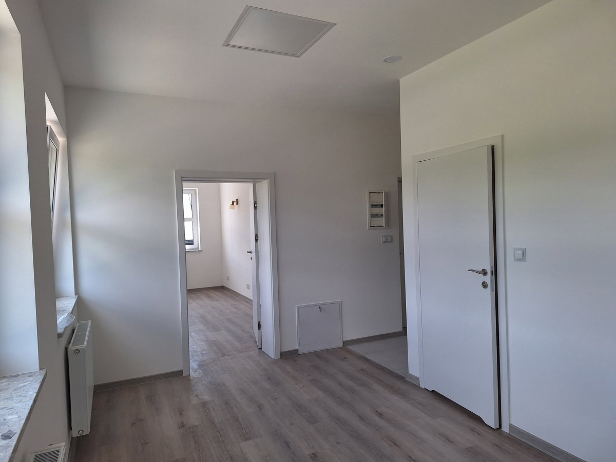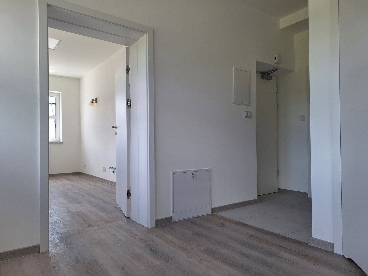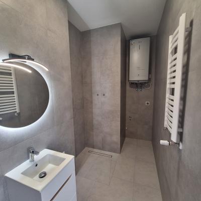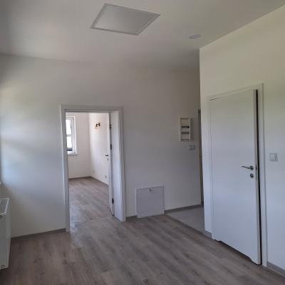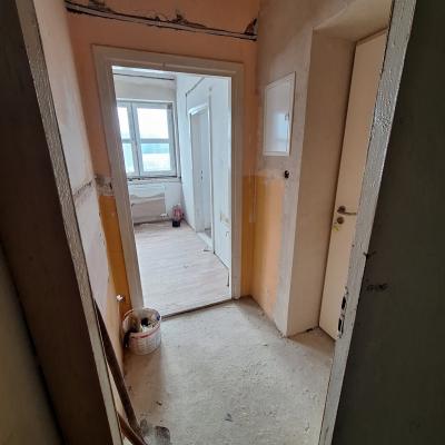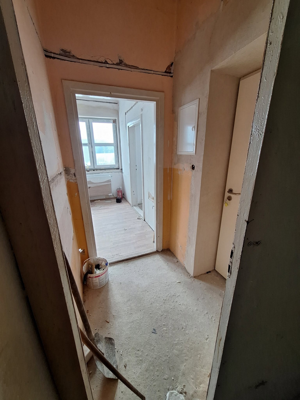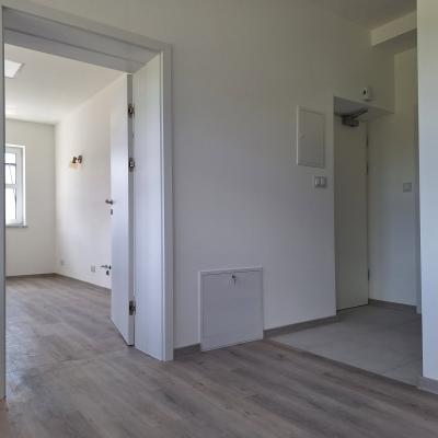 Wykonana została ściana działowa oraz obniżenie sufitów. Nowa posadzka wykonana została z płyt OSB posadowionych na legarach drewnianych z kotwiczeniem do ścian. Ponadto wykonano nową instalacje m.in. elektryczną oraz wodno – kanalizacyjną i nową wentylację. Zamontowano stolarkę drzwiową wraz z ościeżnicami opaskowymi. Podłoga została wykonana z paneli winylowych oraz płytek gresowych w pomieszczeniach mokrych wraz z cokolikami. Pod oknami zamontowano nowe parapety z aglomarmuru. W pomieszczeniu toalety zamontowano ustęp z płuczką ustępową typu kompakt, grzejnik elektryczny, umywalkę, lustro, wieszaki na ręczniki, uchwyt na papier.