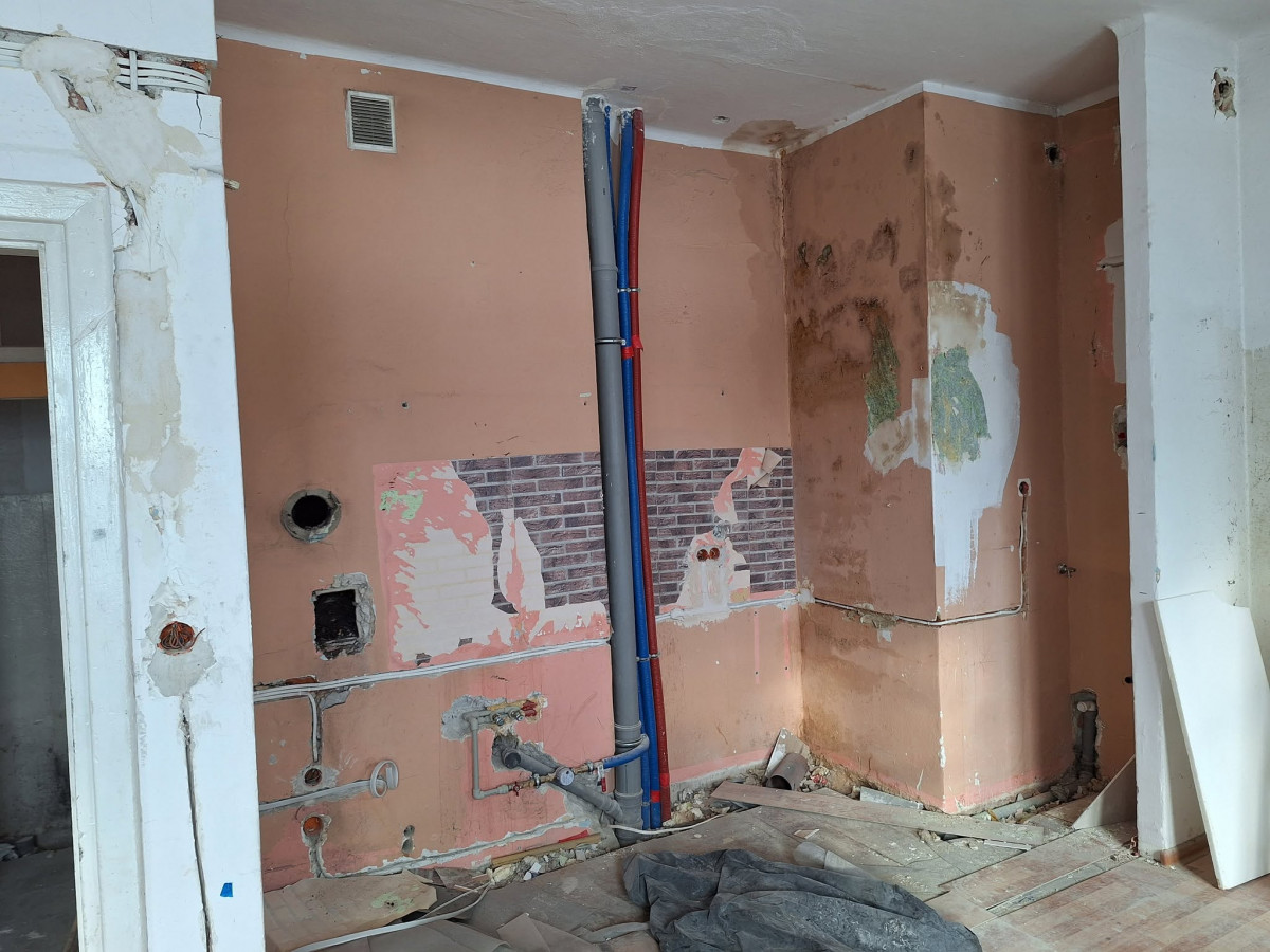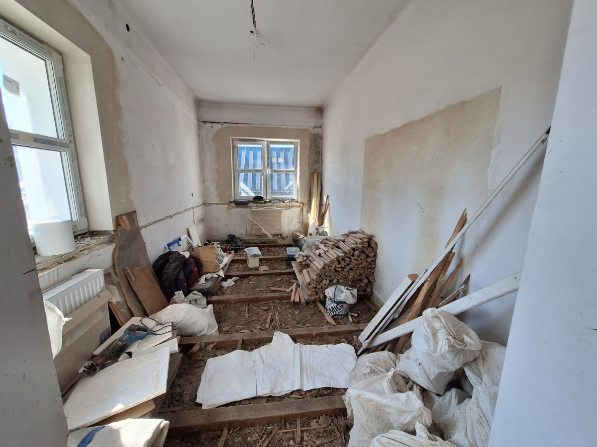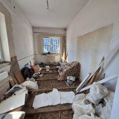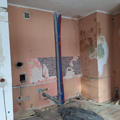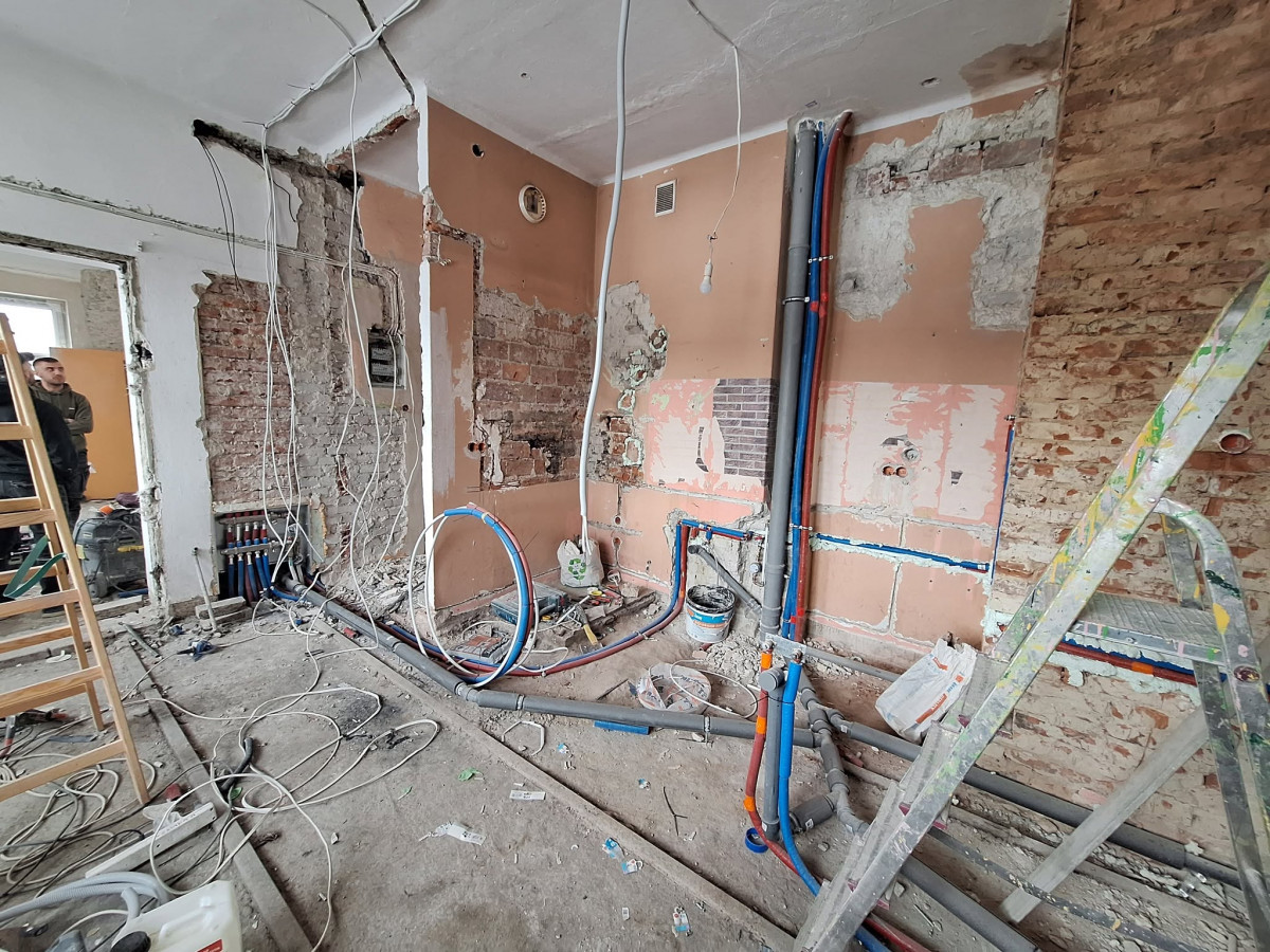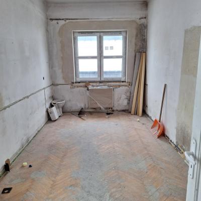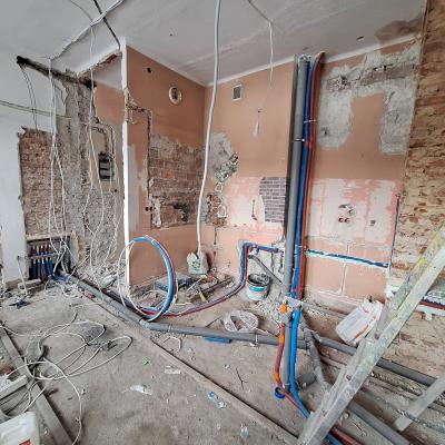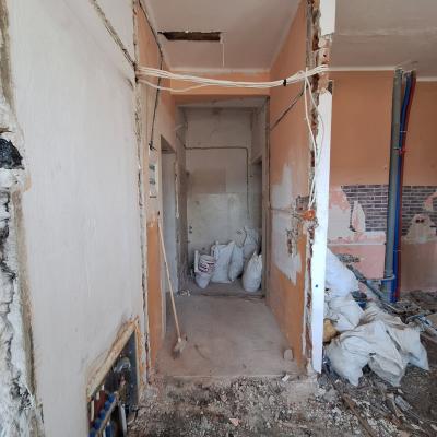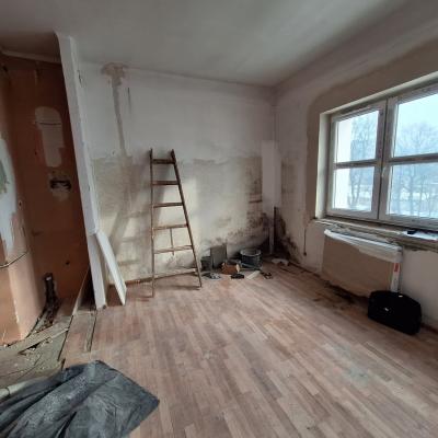 Wykonane zostały roboty rozbiórkowe posadzek, odbicie tynków i oczyszczenie murów, wykucie ościeżnic, naprawienie uszkodzeń w murach z cegieł, zaprawienie bruzd, uzupełnienie tynków. W dalszej kolejności ściany zostały zagruntowane, wyszpachlowanie masą gipsową oraz pomalowane farbą akrylową.