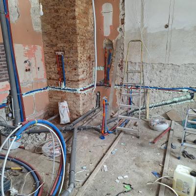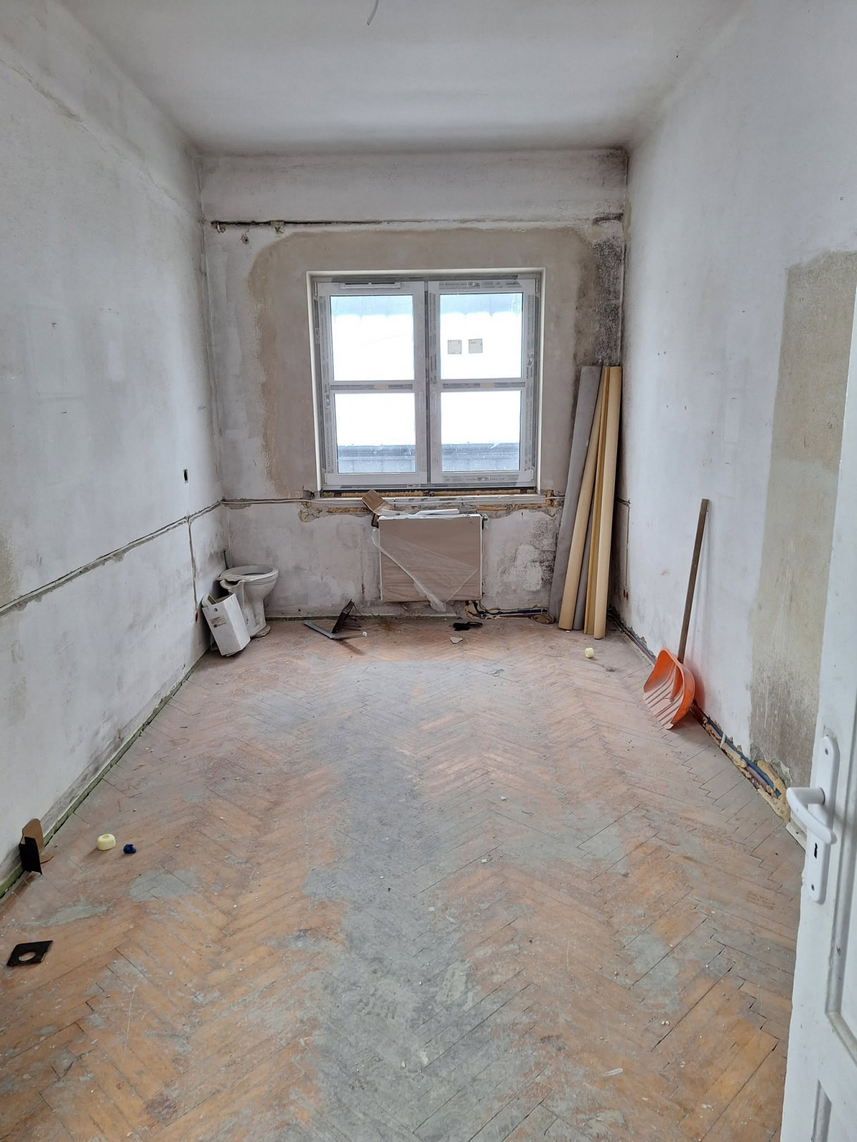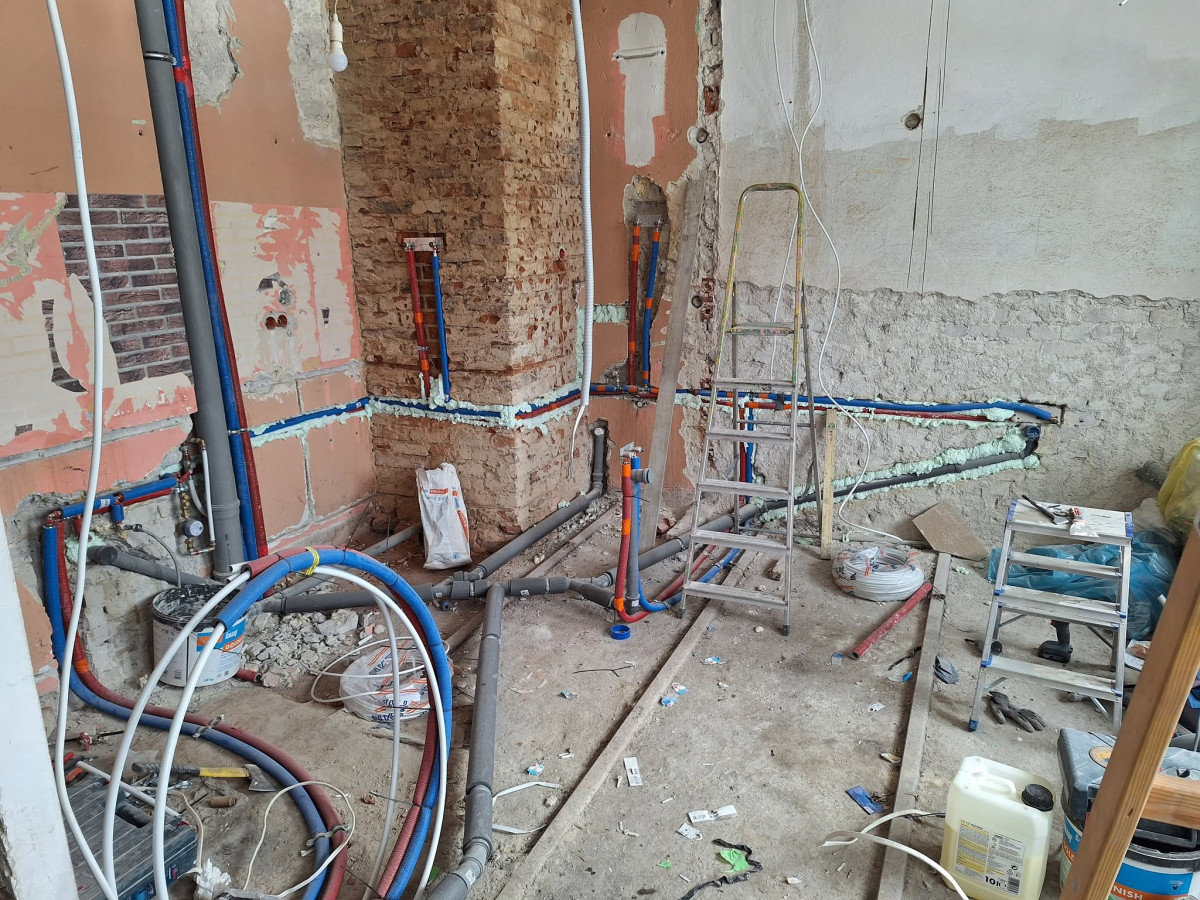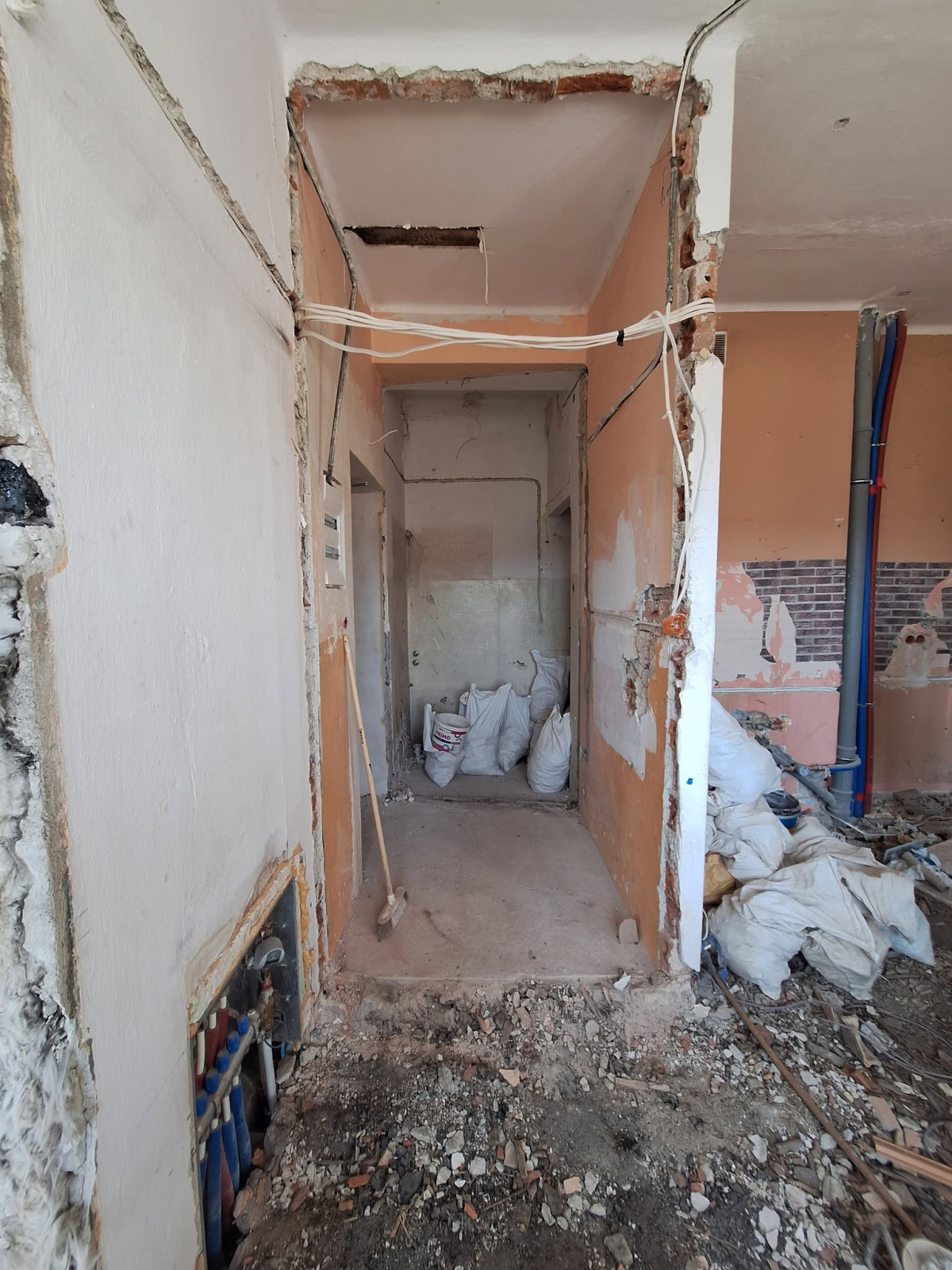 Wykonane zostały roboty rozbiórkowe posadzek, odbicie tynków i oczyszczenie murów, wykucie ościeżnic, naprawienie uszkodzeń w murach z cegieł, zaprawienie bruzd, uzupełnienie tynków. W dalszej kolejności ściany zostały zagruntowane, wyszpachlowanie masą gipsową oraz pomalowane farbą akrylową.