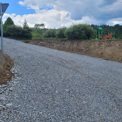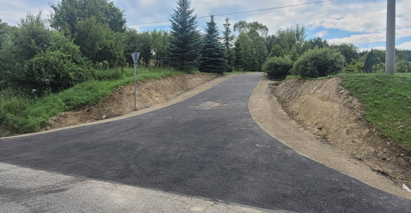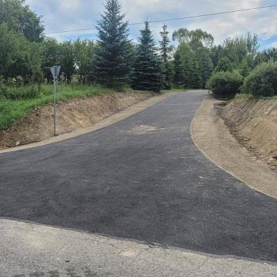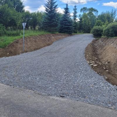 Zakres prac obejmuje wykonanie drogi na długości 20m o szerokości jezdni 3m i poboczy 2x0,75m dwukrotnie powierzchniowe utrwalanej. Ponadto wykonano zjazd o powierzchni 78,2m2, długości 8,4m, szerokości 5m, w tym jezdnia 3,5m i pobocza 2x0,75m oraz wymieniono przepust o długości 12m. Ponadto zakres robót do wykonania obejmował: roboty pomiarowe przy liniowych robotach ziemnych, rozebranie przepustu, roboty ziemne (oczyszczenie rowu, wykop pod przepust, obniżenie niwelety), montaż przepustu wraz z umocnieniem skarp przepustu z kostki betonowej, wykonanie koryta na poszerzeniach jezdni, profilowanie i zagęszczenie podłoża pod warstwy konstrukcyjne nawierzchni, ułożenie geowłókniny, wykonanie podbudowy z warstw kruszywa naturalnego oraz łamanego, dwukrotne powierzchniowe utrwalenie nawierzchni drogowych emulsją asfaltową z kruszywem naturalnym, oznakowanie pionowe i inwentaryzację geodezyjną powykonawczą.