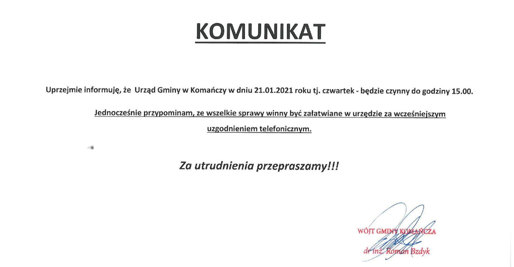 Uprzejmie informuję, że Urząd Gminy w Komańczy w dniu 21.01.2021 roku tj. czwartek - będzie czynny do godziny 15.00.