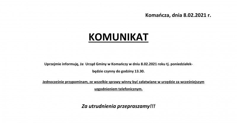 Uprzejmie informuję, że Urząd Gminy w Komańczy w dniu 8.02.2021 roku tj. poniedziałek-