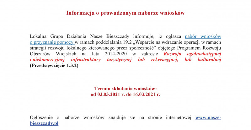 Lokalna Grupa Działania Nasze Bieszczady informuje, iż ogłasza nabór wniosków o przyznanie pomocy w ramach poddziałania 19.2 „Wsparcie na wdrażanie operacji w ramach strategii rozwoju lokalnego kierowanego przez społeczność” objętego Programem Rozwoju Obszarów Wiejskich na lata 2014-2020 w zakresie Rozwoju ogólnodostępnej i niekomercyjnej infrastruktury turystycznej lub rekreacyjnej, lub kulturalnej (Przedsięwzięcie 1.3.2)