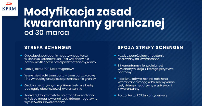 Sytuacja związana ze zwiększoną liczbą zachorowań na COVID-19 jest bardzo dynamiczna. Dotyczy nie tylko Polski, ale także innych krajów europejskich, np. Niemiec. Dlatego ujednolicamy zasady kwarantanny, zarówno jeśli chodzi o transport lądowy, jak i lotniczy. Podróżni przybywający do Polski ze strefy Schengen będą podlegali obowiązkowej kwarantannie, chyba że przedstawią negatywny wynik testu na COVID-19, nie starszy niż 48 godzin. Natomiast przybywający spoza strefy Schengen, będą bez wyjątku kierowani na kwarantannę, niezależnie od posiadanego testu. Osoby zaszczepione będą zwolnione z kwarantanny. Nowe zasady będą obowiązywały od wtorku, 30 marca.
