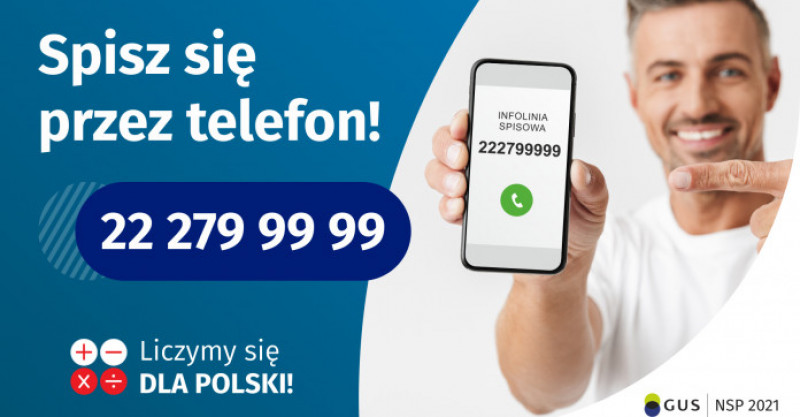Podczas Narodowego Spisu Powszechnego 2021 podstawową i obowiązkową metodą spisową jest samospis internetowy. Jeśli nie masz komputera lub Internetu istnieje wygodna i bezpieczna opcja: spisu przez telefon. Infolinia spisowa dostępna jest pod numerem 22 279 99 99.