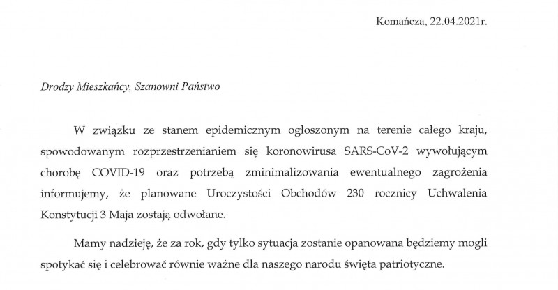 W związku ze stanem epidemicznym ogłoszonym na terenie całego kraju, spowodowanym rozprzestrzenianiem się koronowirusa SARS-CoV-2 wywołującym chorobę COVID-19 oraz potrzebą zminimalizowania ewentualnego zagrożenia informujemy, że planowane Uroczystości Obchodów 230 rocznicy Uchwalenia Konstytucji 3 Maja zostają odwołane.