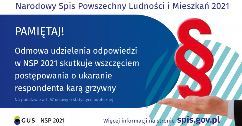 Udział w Narodowym Spisie Powszechnym Ludności i Mieszkań 2021 jest obowiązkowy. Odmowa udziału w spisie powszechnym wiąże się z możliwością nałożenia kary grzywny, co jest ujęte w art. 57 ustawy o statystyce publicznej.