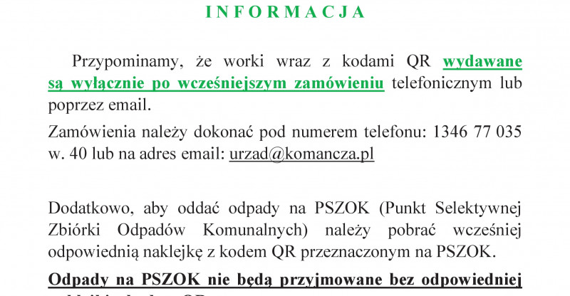 Przypominamy, że worki wraz z kodami QR wydawane są wyłącznie po wcześniejszym zamówieniu telefonicznym lub poprzez email.