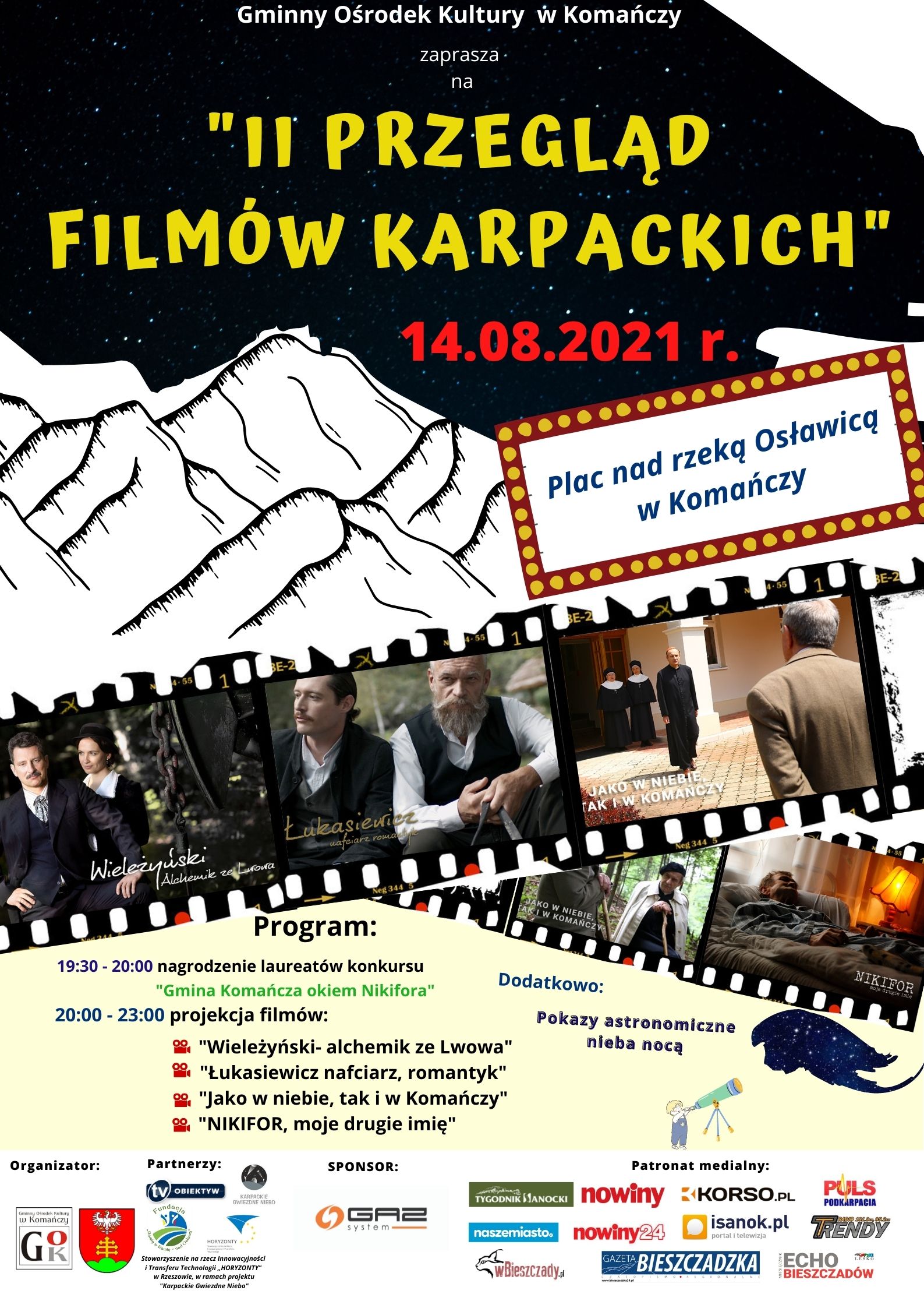 II Przegląd Filmów Karpackich w Komańczy Gminny Ośrodek Kultury w Komańczy zaprasza na II Przegląd Filmów Karpackich, który będzie miał miejsce w sobotę 14 sierpnia 2021r. w godzinach od 19:30 - 23:00 na placu nad rzeką Osławicą. W trakcie wydarzenia kulturalnego emitowane zostaną cztery filmy produkcji TV Obiektyw. Warto wspomnieć, że jest to seria filmów dokumentalnych powstałych w ramach „Historycznego Pejzażu Podkarpacia”, która opowiada o wybitnych ludziach i wydarzeniach z naszego regionu. Pokaz filmowy zostanie poprzedzony nagrodzeniem laureatów konkursu: „Gmina Komańcza okiem Nikifora”. Poniżej zachęcamy do zapoznania się z fabułą filmów jakie zostaną zaprezentowane: - „Wileżyński – alchemik ze Lwowa” – do dokument fabularyzowany poświęcony Marianowi Wieleżyńskiemu - pionierowi polskiego gazownictwa i założycielowi pierwszej na świecie firmy opartej na akcjonariacie pracowniczym. W filmie zobaczyć można m.in. Wojciecha Zielińskiego, Annę Cieślak oraz Marcina Kwaśnego. Jest to najnowsza produkcja Telewizji Obiektyw, której to premiera miała miejsce w czerwcu 2021 r. -„Łukasiewicz - nafciarz, romantyk” - fabularyzowany dokument, opowiadający o życiu i działalności wynalazczej, przemysłowej, oraz społecznej Ignacego Łukasiewicza. Film obejmuje lata 1848 -1870 od momentu rozpoczęcia przez Łukasiewicza we Lwowie pracy farmaceuty, do uruchomienia rafinerii w Chorkówce. Scenariusz powstał w oparciu o pierwszy wywiad, jaki przeprowadził z Ignacym Łukasiewiczem krakowski dziennikarz Feliks Jan Szczęsny – Morawski. -„Nikifor, moje drugie imię” - to fabularyzowana opowieść o Nikiforze Krynickim, który zaliczony jest do światowej czołówki malarzy prymitywizmu. Film powstał w 2009r. i opowiada o ostatnich dniach życia artysty spędzonych w sanatorium gruźliczym w Foluszu koło Jasła. Nikifor sprawiał wrażenie upośledzonego, żył w samotności i ubóstwie. Pozostawił po sobie wiele prac. Najchętniej malował akwarelą, czasami łączoną z temperą bądź farbą olejną. - „Jako w niebie, tak i w Komańczy” – film opowiada o pobycie Prymasa Polski Stefana Kardynała Wyszyńskiego w Komańczy, gdzie był przetrzymywany w czasie internowania w latach 1955-56. Scenariusz filmu został oparty na historycznych materiałach archiwalnych, wspomnieniach siostry Bogumiły oraz pamiętnikach samego Prymasa Wyszyńskiego. Informujemy, że Operator Gazociągów Przesyłowych GAZ-SYSTEM S.A. jest Sponsorem wydarzenia „II PRZEGLĄD FILMÓW KARPACKICH”. GAZ-SYSTEM jest spółką strategiczną dla polskiej gospodarki. Odpowiadamy za przesył gazu ziemnego oraz zarządzamy najważniejszymi gazociągami w Polsce i jesteśmy właścicielem terminalu LNG w Świnoujściu im. Prezydenta Lecha Kaczyńskiego. W ramach programu inwestycyjnego 2015-2025 GAZ-SYSTEM realizuje ponad 2000 km nowych gazociągów w zachodniej, południowej i wschodniej części Polski. Trwa budowa kilkunastu nowych gazociągów w ramach Korytarza Gazowego Północ-Południe oraz tłoczni w Kędzierzynie-Koźlu, a także budowa połączeń międzysystemowych z Litwą i Słowacją. Projektowane są gazociągi lądowe, które połączą planowany terminal pływający FSRU w Zatoce Gdańskiej z krajowym systemem przesyłowym. Prowadzona jest rozbudowa terminalu LNG w Świnoujściu, w wyniku której o ponad połowę zwiększą się zdolności regazyfikacyjne tego obiektu. Spółka realizuje także jedno z najważniejszych przedsięwzięć infrastrukturalnych w kraju – projekt Baltic Pipe, polegający na wybudowaniu dwukierunkowego gazociągu morskiego łączącego Polskę i Danię oraz rozbudowie lokalnej sieci przesyłowej i 3 tłoczni gazu. Więcej informacji o spółce GAZ-SYSTEM, znajduje się na stronie www.gaz-system.pl.
