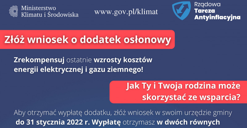 Od 4 stycznia do 31 października 2022 roku można składać wnioski o dodatek osłonowy. Dodatek osłonowy stanowi element rządowej tarczy antyinflacyjnej, który ma zniwelować rosnące ceny energii, gazu i żywności.