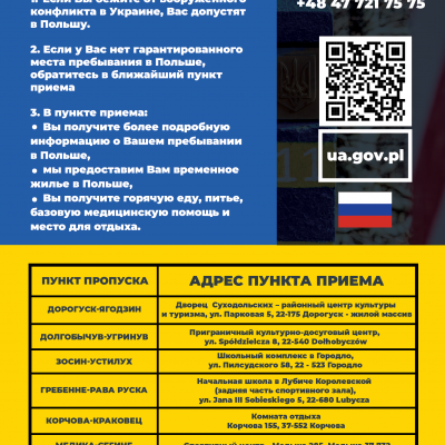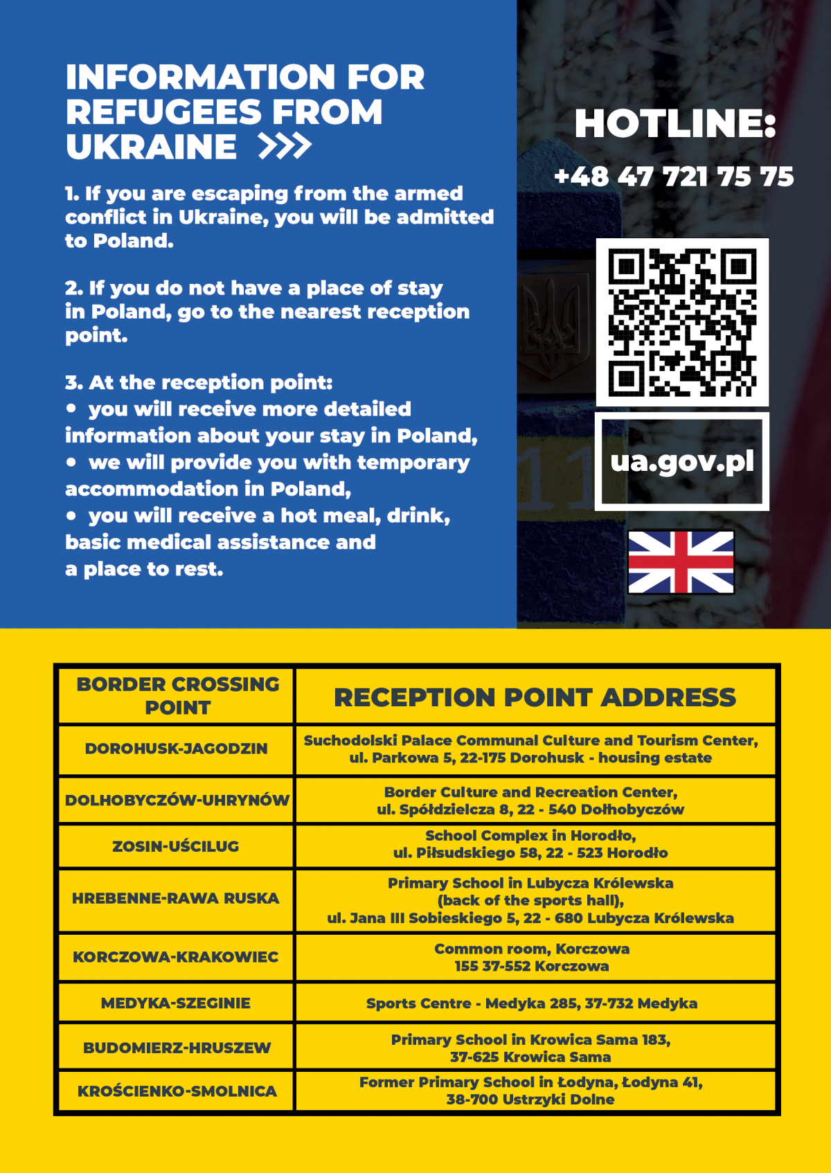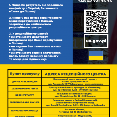 Інформація для біженців з України1. Якщо Ви рятуєтесь від збройного конфлікту в Україні, Ви зможете в'їхати до Польщі. 2. Якщо у Вас немає гарантованого місця перебування в Польщі, зверніться до найближчого рецепційного центра. 3. У рецепційному центрі: