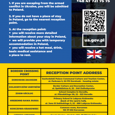 Information for refugees from Ukraine1. If you are escaping from the armed conflict in Ukraine, you will be admitted to Poland. 2. If you do not have a place of stay in Poland, go to the nearest reception point. 3. At the reception point: