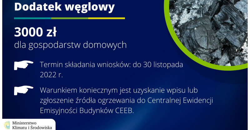 Uwaga mieszkańcy! W Urzędzie Gminy Komańcza rozpoczął się nabór wniosków o wypłatę dodatku węglowego dla gospodarstwa domowego, który wynosi 3000 złotych. Wnioski można składać w terminie do dnia 30 listopada 2022 r. w gminie właściwej ze względu na miejsce zamieszkania osoby składającej ten wniosek.
