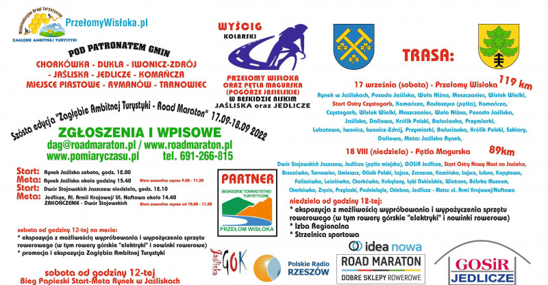 W imieniu własnym oraz wójtów i burmistrzów 16 gmin województwa podkarpackiego uprzejmie zapraszamy do przybycia na trasy naszego wyścigu kolarskiego oraz do wzięcia udziału w spotkaniu Rady Zagłębia Ambitnej Turystyki, odbywającym się tradycyjnie, przy okazji rozgrywania zawodów kolarskich. Wyścigi ze startu wspólnego odbędą się: * w sobotę, 17. września 2022 r. – zarówno start (o godzinie 12.00) jak i meta (około ok. 16-tej) na rynku w Jaśliskach; dystans: 119 km.; * w niedzielę, 18. września 2022 r. - start z parkingu przy Dworze Stojowskich w Jaszczwi o godz. 12.10 a meta w Jedliczu, na ul. Armii Krajowej (przy skrzyżowaniu z ul. Naftową) – przed godziną 15-tą; zakończenie w odległym o kilkaset metrów Dworze Stojowskich; dystans 83 km. Ceremonia dekoracji zwycięzców zawodów będzie miała miejsce o 17.00 - w sobotę oraz o 15.30 - w niedzielę.