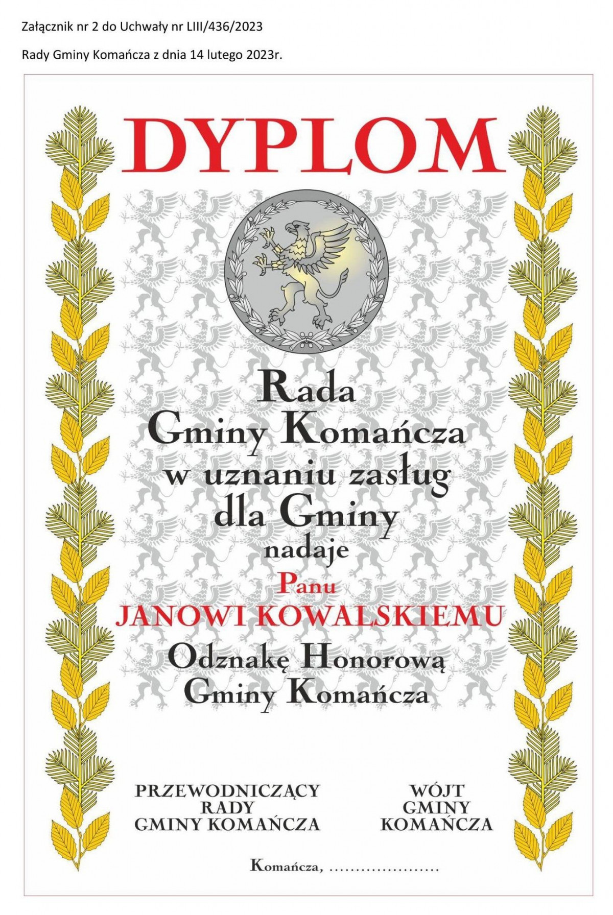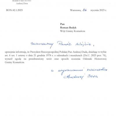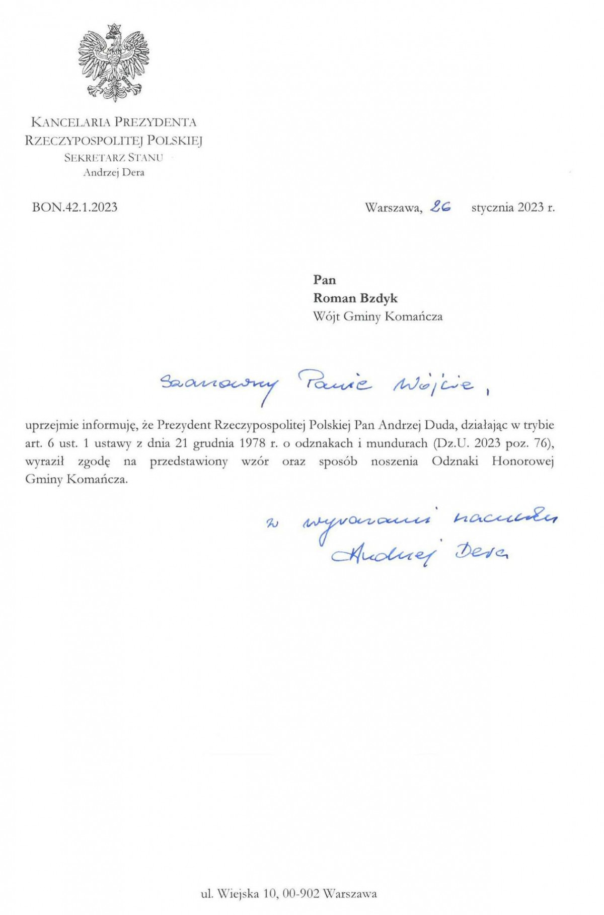 Zgodnie z art. 6 ust. 1 ustawy z dnia 21 grudnia 1978 r. o odznakach i mundurach wzór Odznaki został przekazany również do Prezydenta Rzeczypospolitej Polskiej celem uzyskania zgody. Pismem znak BON.42.1.2023 Prezydent wyraził zgodę na przedstawiony wzór oraz sposób noszenia Odznaki Honorowej Gminy Komańcza.