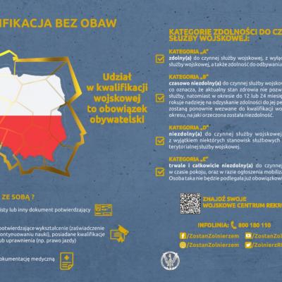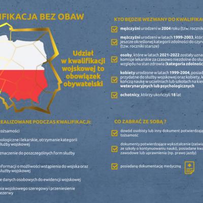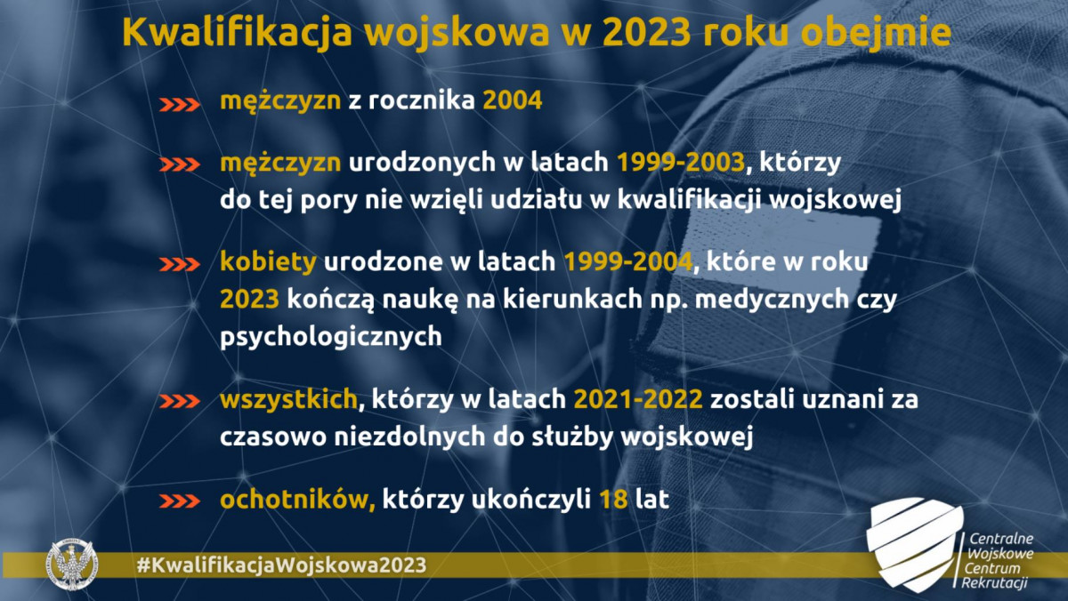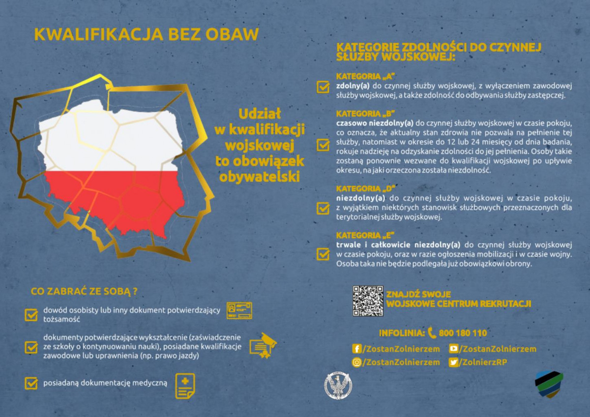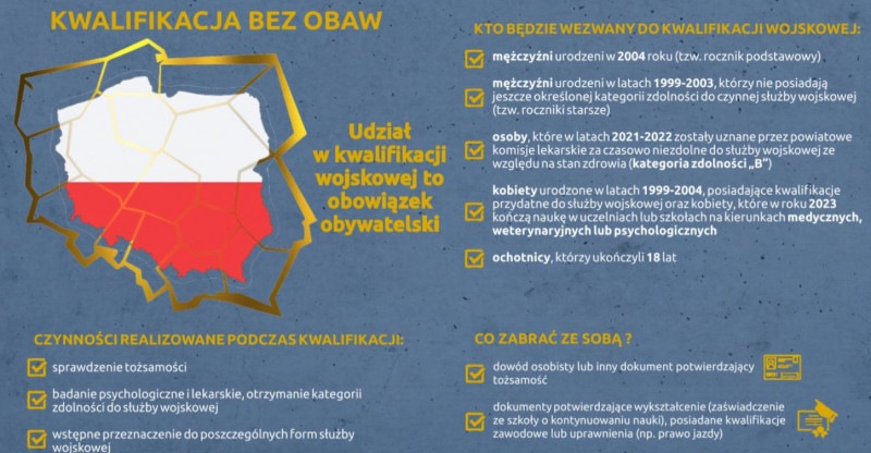Informujemy że na terenie Powiatu Sanockiego w dniach 18.04-28.04 oraz 08.05-30.05.2023r. od godz. 8.00 do 16.00 odbędzie się kwalifikacja wojskowa.