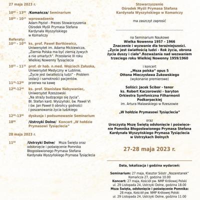 - Niedziela 28.05.2023 r. o godz. 11.00, kościół pw. NMP Królowej Polski w Ustrzykach Dolnych - uroczysta Msza Święta, odsłonięcie i poświęcenie Pomnika Błogosławionego Prymasa Stefana Kardynała Wyszyńskiego