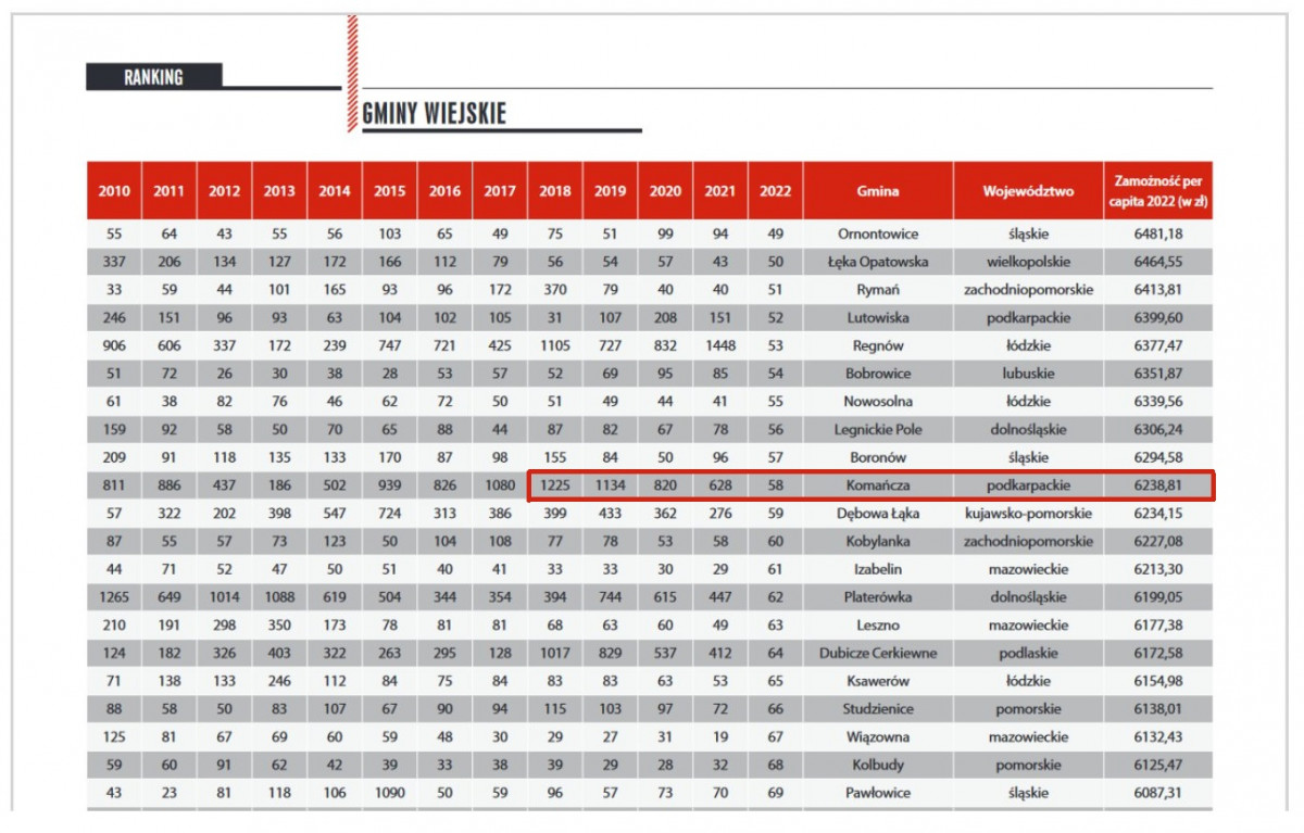 Pragniemy nadmienić, że Gmina KOMAŃCZA, na przestrzeni ostatnich 5 lat, awansowała pod względem zamożności i zajęła z 1225. (2018 rok) na 58. miejsce (2022 rok) - zamożność na osobę w 2022 roku wyniosła 6238,81 zł.