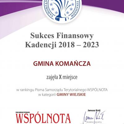 Autorzy rankingu publikowanego cyklicznie przez Pismo Samorządu Terytorialnego „WSPÓLNOTA”, za pomocą wskaźników liczbowych oszacowali sukces, jaki odniosły samorządy w trakcie mijającej kadencji. Ranking Sukces Kadencji 2018-2023 jest autorstwa prof. Pawła SWIANIEWICZA z Uniwersytetu Przyrodniczego we Wrocławiu, Zakład Studiów Społeczno-Ekonomicznych. Ranking powstał na podstawie następującego kryterium tj. zmiana wielkości budżetu w przeliczeniu na 1 mieszkańca w latach 2017-2022. Pod uwagę były wzięte wszystkie „potencjalne” (tzn. uwzględniające skutki obniżek podatków lokalnych) dochody oprócz dotacji celowych i po odjęciu przekazywanych przez gminy składek na tzw. „podatek janosikowy”.