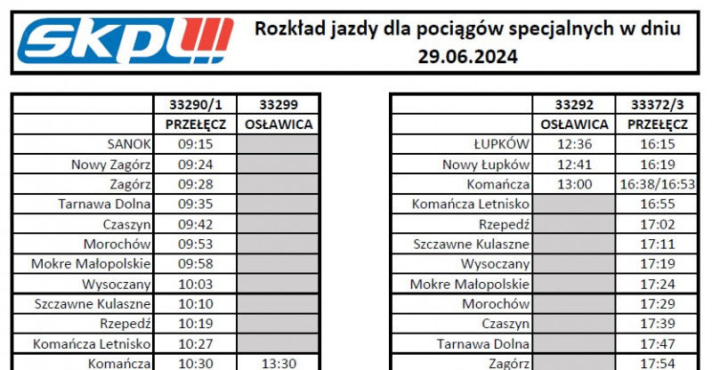 Rozkład jazdy dla pociągów specjalnych kursujących w dniu 29.06 z okazji Jubileuszu 150-lecia Tunelu Łupkowskiego.