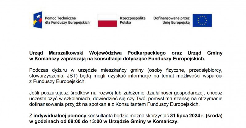 Urząd Marszałkowski Województwa Podkarpackiego oraz Urząd Gminy w Komańczy zapraszają na konsultacje dotyczące Funduszy Europejskich.