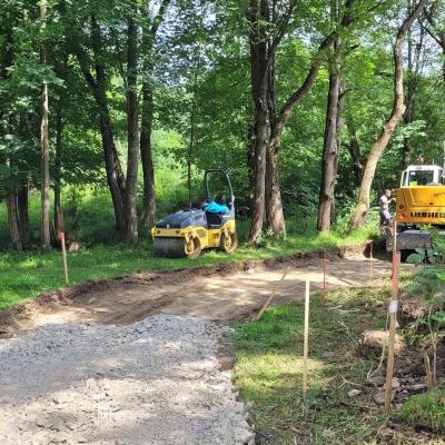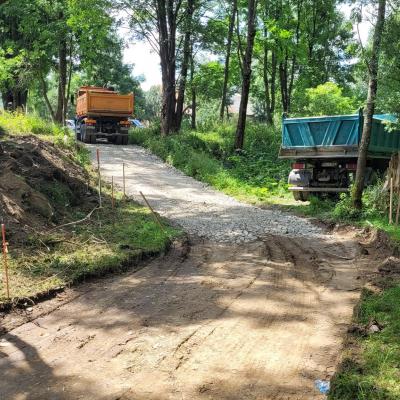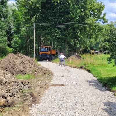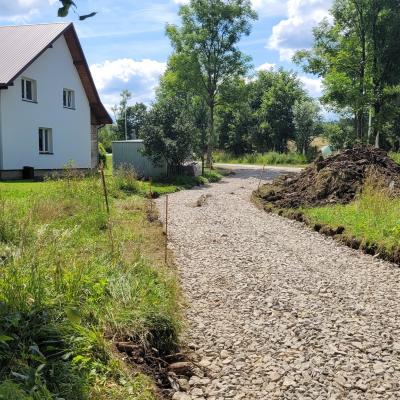 W zakresie prac wykonano roboty przygotowawcze, w tym roboty pomiarowe przy liniowych robotach ziemnych, mechaniczne karczowanie pni, usunięcie warstwy ziemi za pomocą spycharki i wykonanie koryta, wykonanie podbudowy poprzez profilowanie i zagęszczanie mechaniczne podłoża pod warstwy konstrukcyjne nawierzchni, wyłożenie podbudowy z kruszywa naturalnego, wykonanie warstwy wzmacniającej grunt pod warstwy technologiczne z geowłókniny, wyrównywanie istniejącej podbudowy tłuczniem sortowanym zagęszczanym mechanicznie, wykonanie części nawierzchni z mieszanek mineralno-bitumicznych grysowych z warstwą wiążącą asfaltową oraz budowa nawierzchni z płyt żelbetowych pełnych.