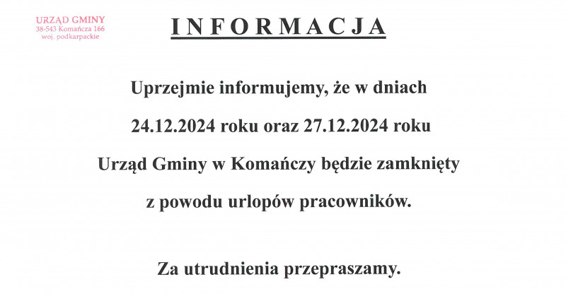 Informacja o godzinach pracy Urzędu Gminy Komańcza